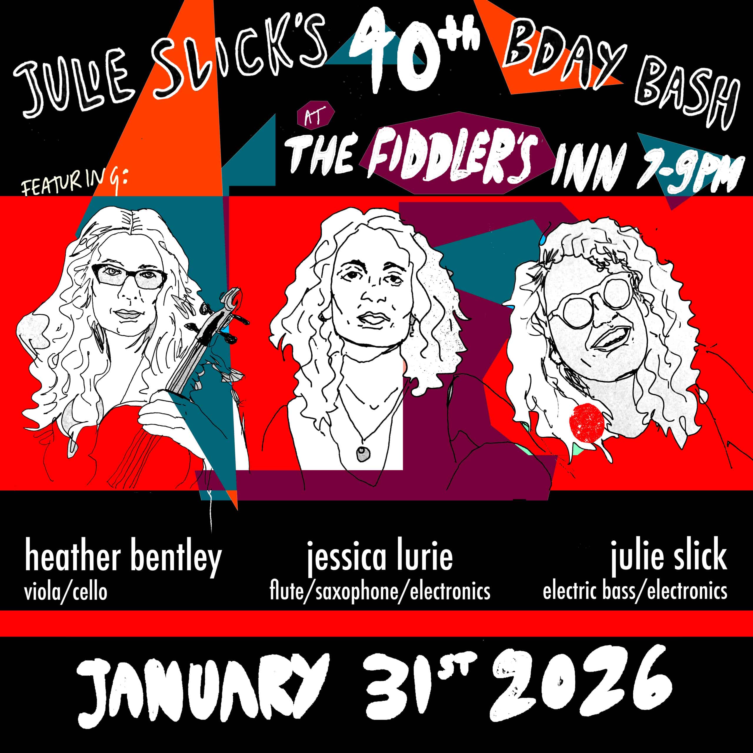 • Sat 1/31 Seattle: Fiddler’s Inn with Jessica Lurie, Heather Bentley & Julie Slick: Woodwinds, strings, loops and grooves, unchartered sonic electronics and spontaneous compositions will open your ears and inspire the tapping of your helpless toe!